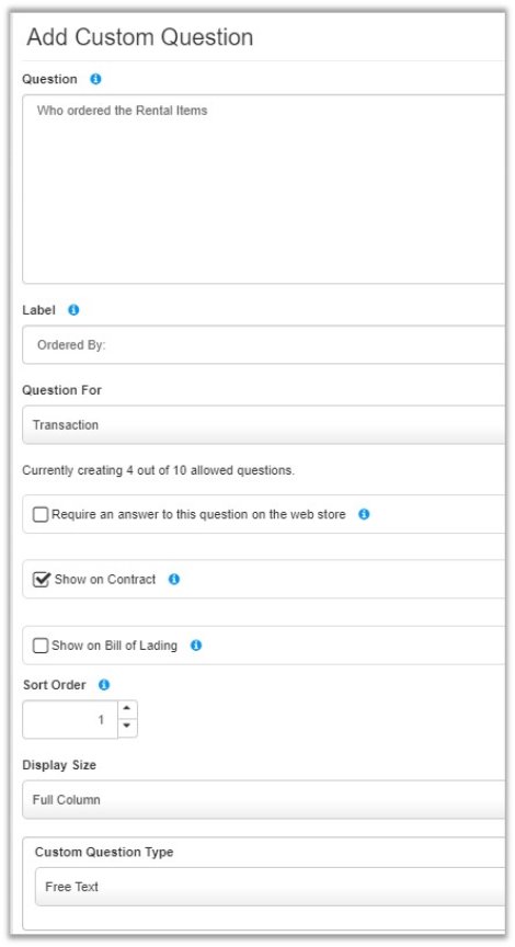 Now let us say your customer has a few contacts you can speak with regarding payment. We know it can be hard to keep up with them and it does not make sense to create each one as a customer. Rental Essentials allows you to create a few custom questions for customers to help solve this problem.