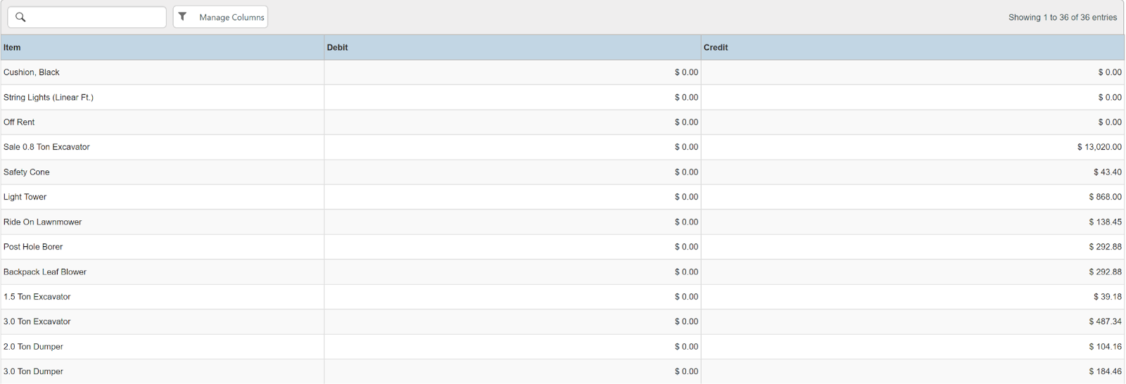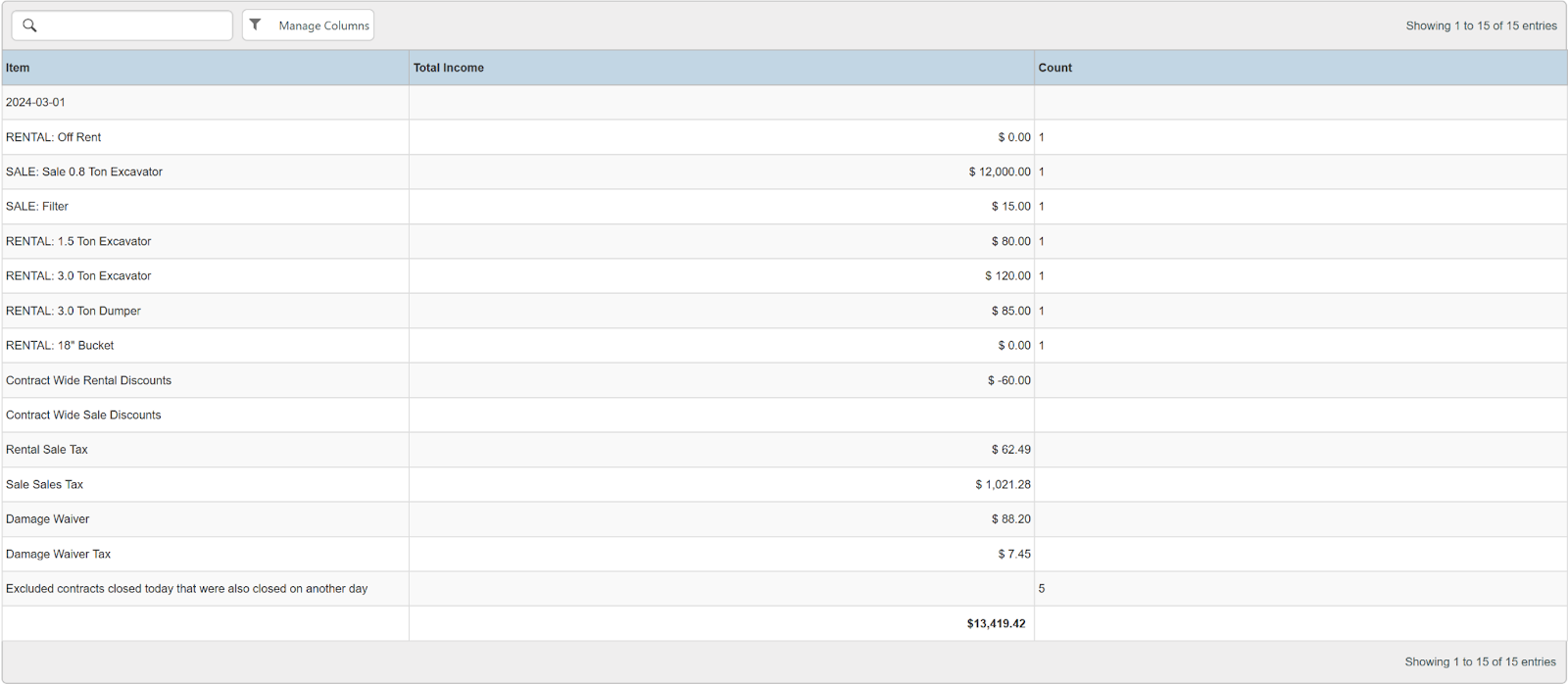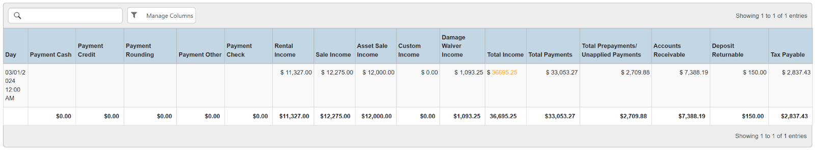 Columns: Day, Payment Cash, Payment Credit, Payment Rounding, Payment Other, Payment Check, Rental Income, Sale Income, Asset Sale Income, Custom Income, Damage Waiver Income, Total Income, Total Payments, Total Prepayments/ Unapplied, Payments, Accounts Receivable, Deposit Returnable, Tax Payable