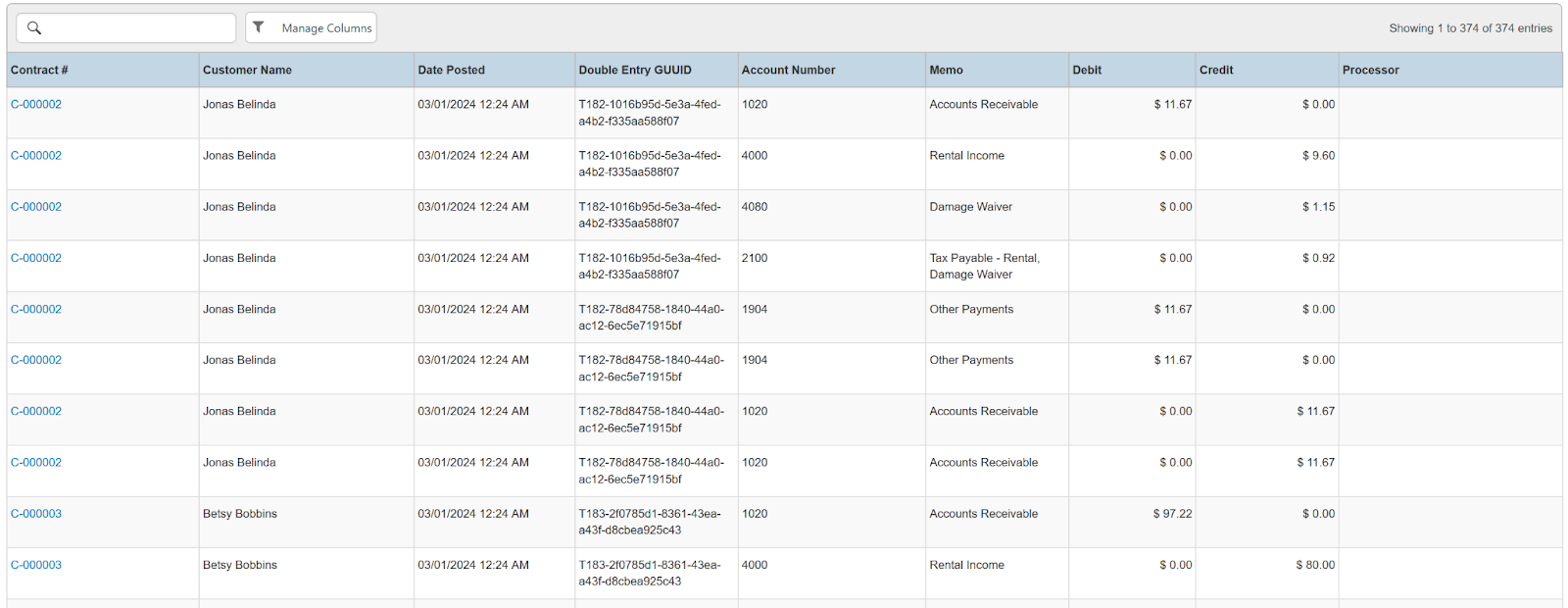 Columns: Contract #, Customer Name, Customer Company, National Id, Remote Id, Date Posted, Double Entry GUUID, Account Number, Memo, Debit, Credit, Processor