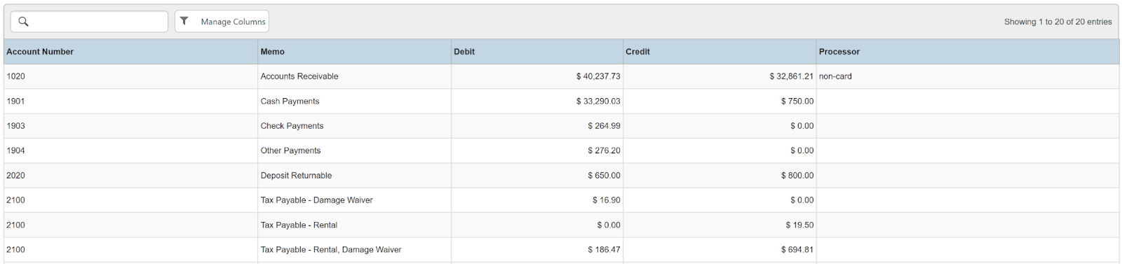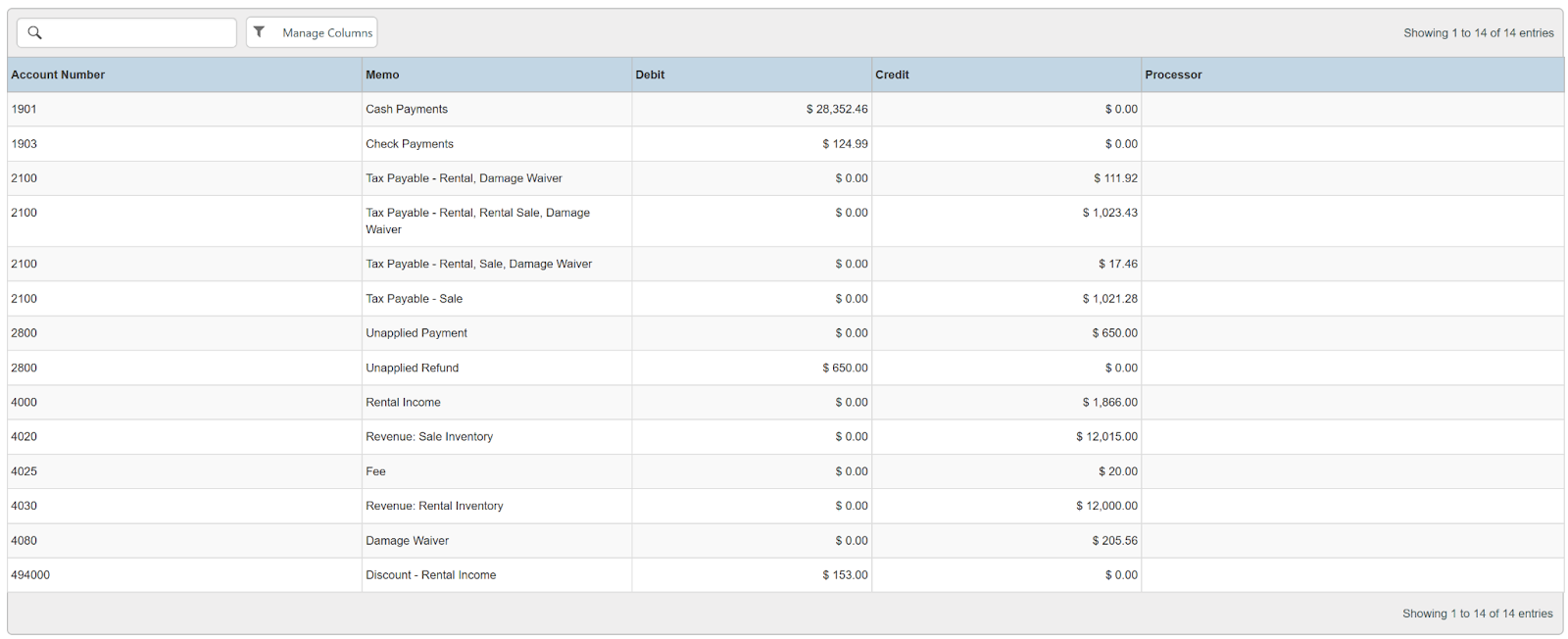 Columns: Account Number, Memo, Debit, Credit, Processor