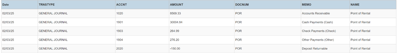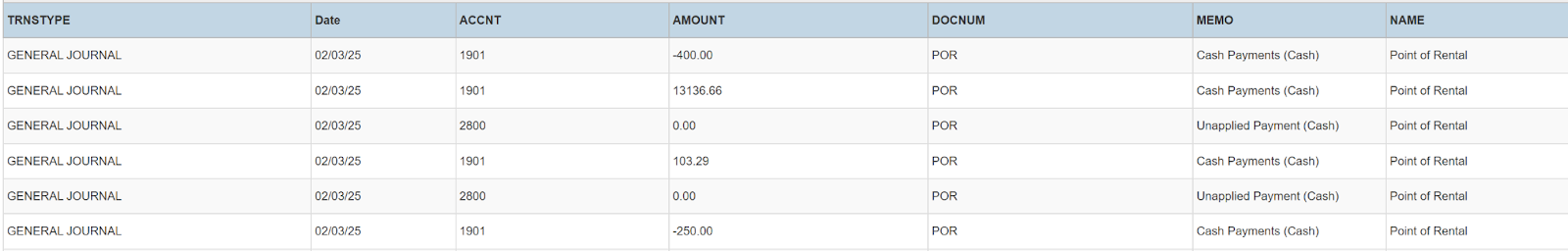 Columns: TRNSTYPE, Date, ACCNT, AMOUNT, DOCNUM, MEMO, NAME