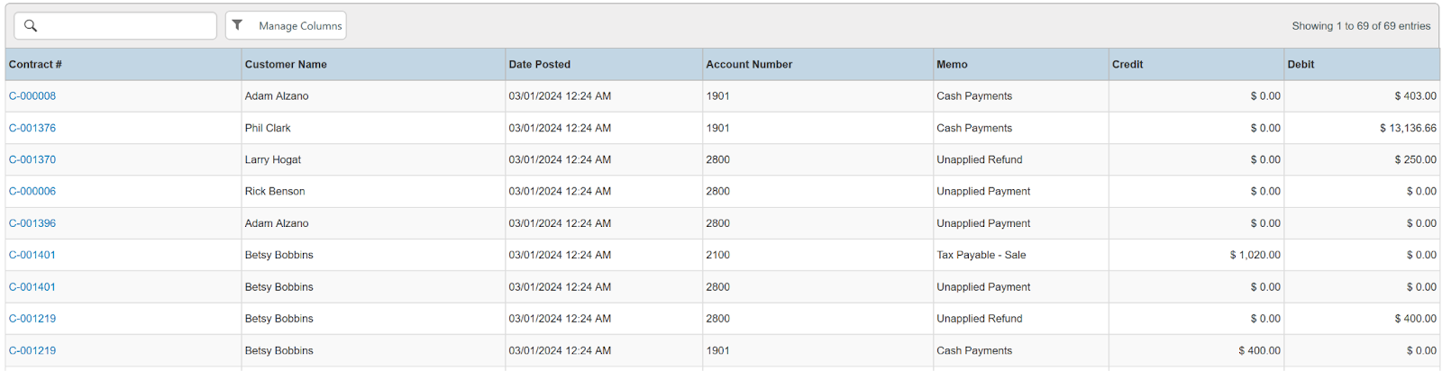 Columns: Contract #, Customer Name, Customer Company, National Id, Remote Id, Date Posted, Account Number, Memo, Credit, Debit
