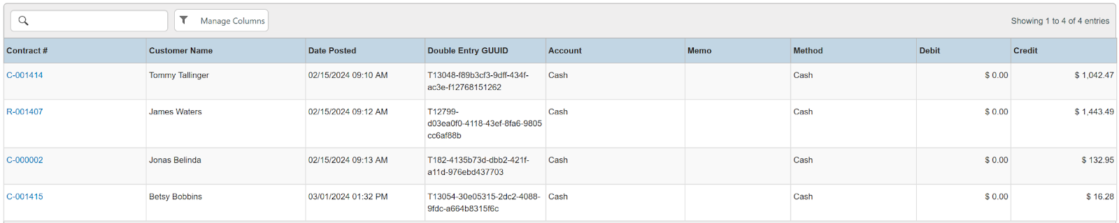 Columns: Contract #, Customer Name, National Id, Remote Id, Date Posted, Double Entry GUUID, Account, Memo, Method, Debit, Credit
