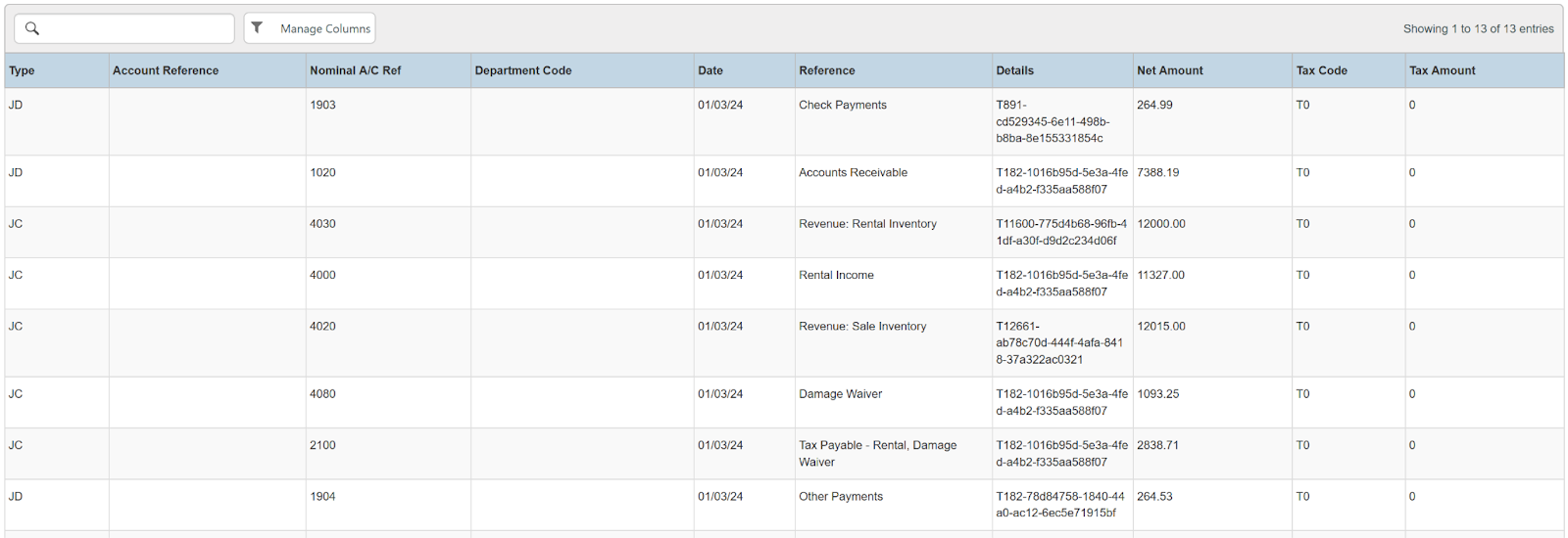 Columns: Type, Account Reference, Nominal A/C Ref, Department Code, Date, Reference, Details, Net Amount, Tax Code, Tax Amount