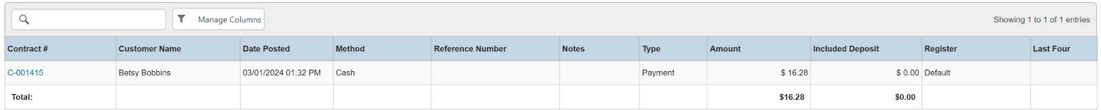 Columns: Contract #, Purchase Order #, Customer Name, National Id, Remote Id, Date Posted, Method, Reference Number, Notes, Type, Amount, Included Deposit, Register, Last Four