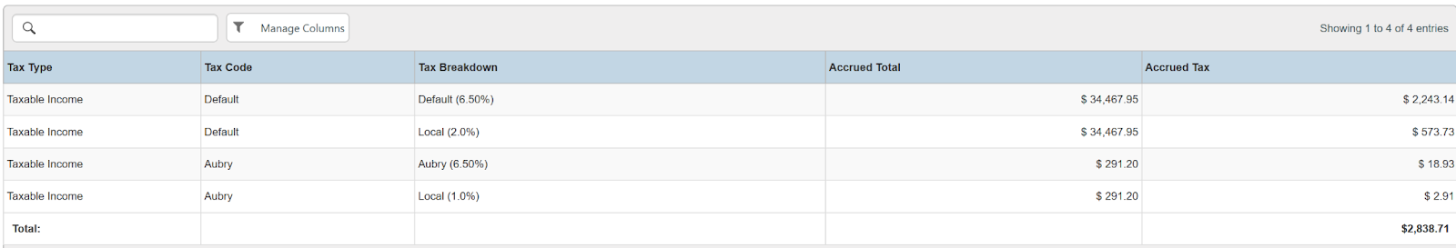 Columns: Tax Type, Tax Code, Tax Breakdown, Accrued Total, Accrued Tax