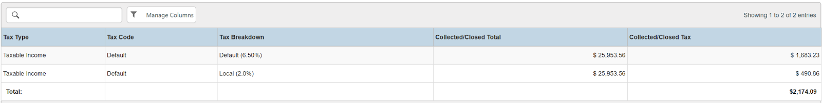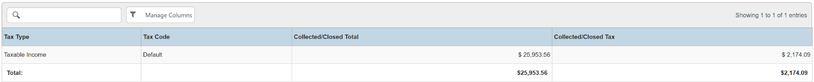 Columns: Tax Type, Tax Code, Tax Breakdown, Collected/Closed Total, Collected/Closed Tax