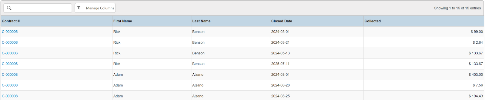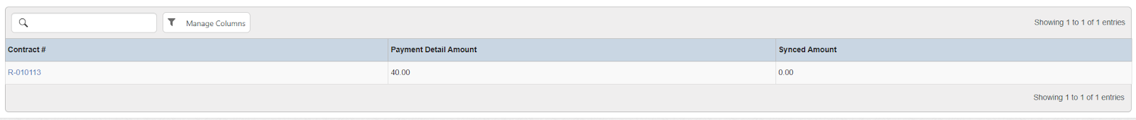 Columns: Contract #, Payment Detail Amount, Synced Amount