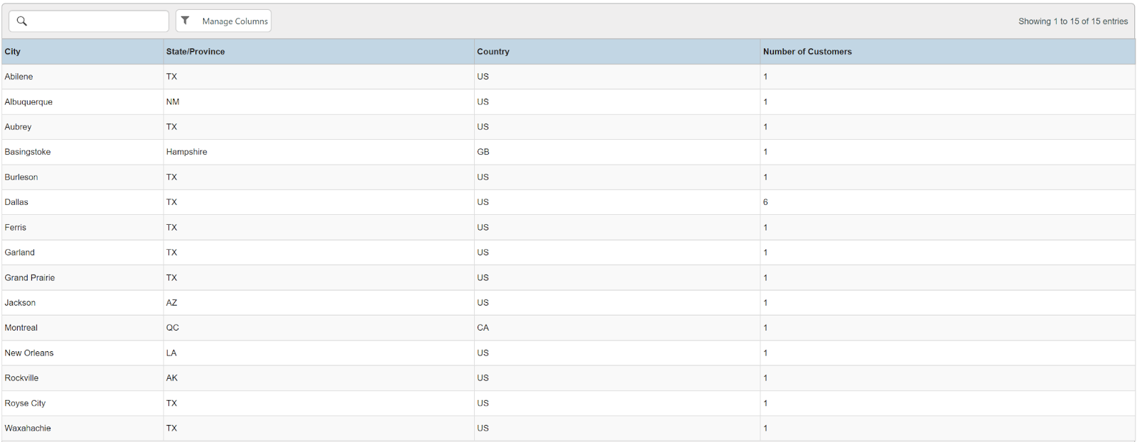 Columns: City, State/Province, Country, Number of Customers