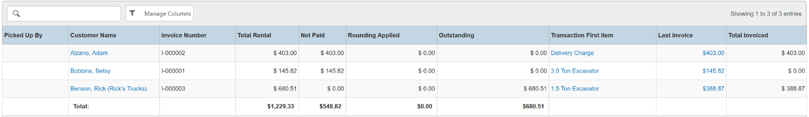 Columns: Picked Up By, Customer Name, National Id, Remote Id, Invoice Number, Total Rental, Net Paid, Rounding Applied, Outstanding, Transaction First Item, Last Invoice, Total Invoiced