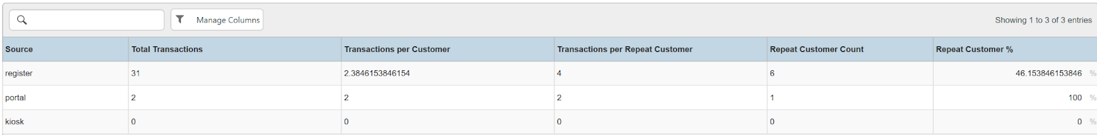 Columns: Source, Total Transactions, Transactions per Customer, Transactions per Repeat Customer, Repeat Customer Count, Repeat Customer %