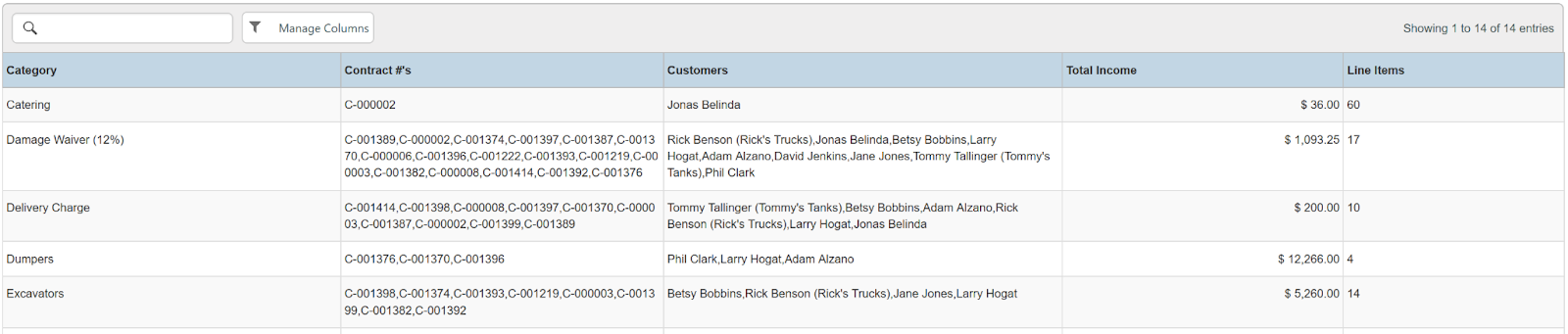 Columns: Category, Contract #'s, Customers, Remote Ids, Total Income, Line Items