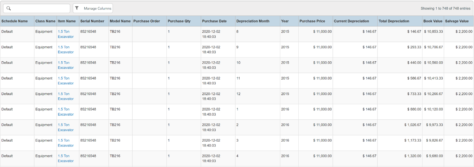 Columns: Schedule Name, Class Name, Item Name, Serial Number, Model Name, Purchase Order, Purchase Qty, Purchase Date, Depreciation Month, Year, Purchase Price, Current Depreciation, Total Depreciation, Book Value, Salvage Value