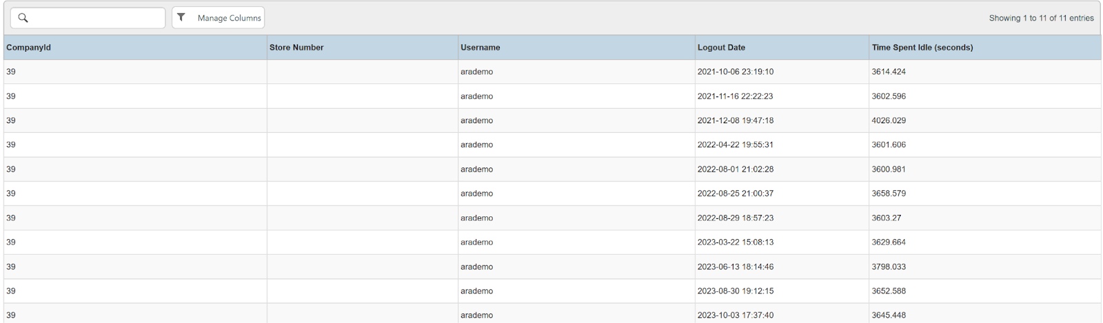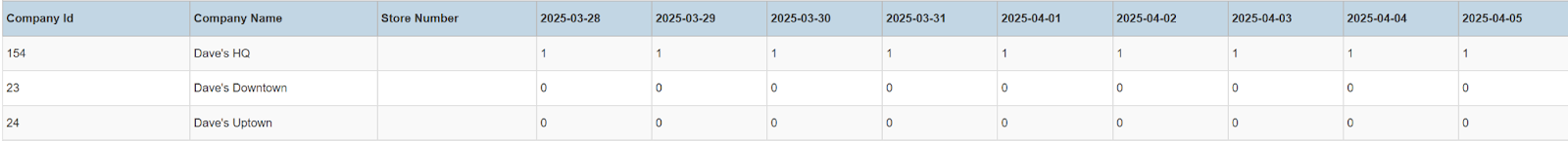 Columns: Company Id, Company Name, Store Number, Dates