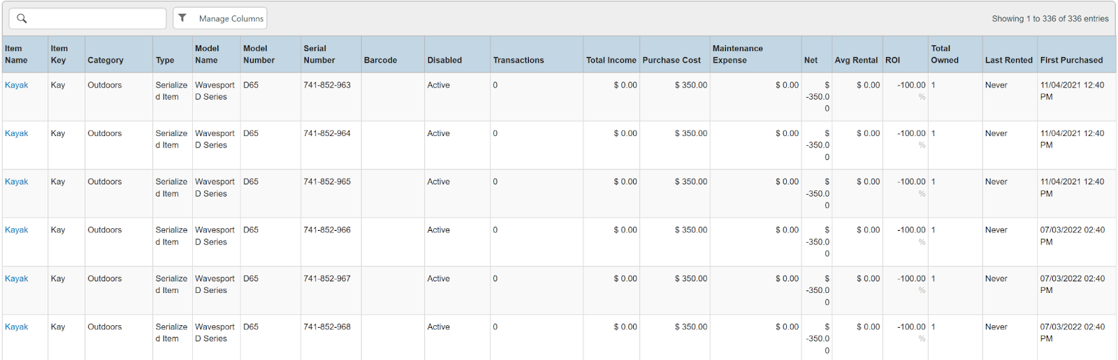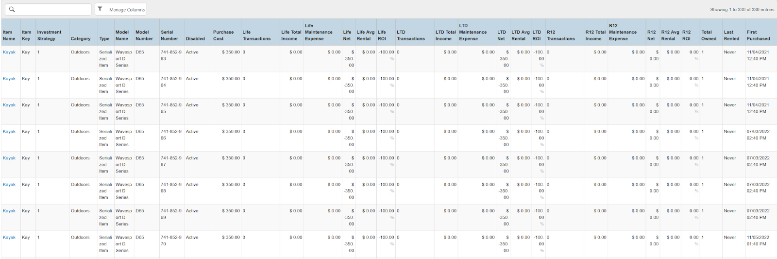 Columns: Category, Transactions, Total Income, Income From Rental, Purchase Cost, Maintenance Expense, Net, Avg Rental, ROI, Total Owned, Last Rented, First Purchased