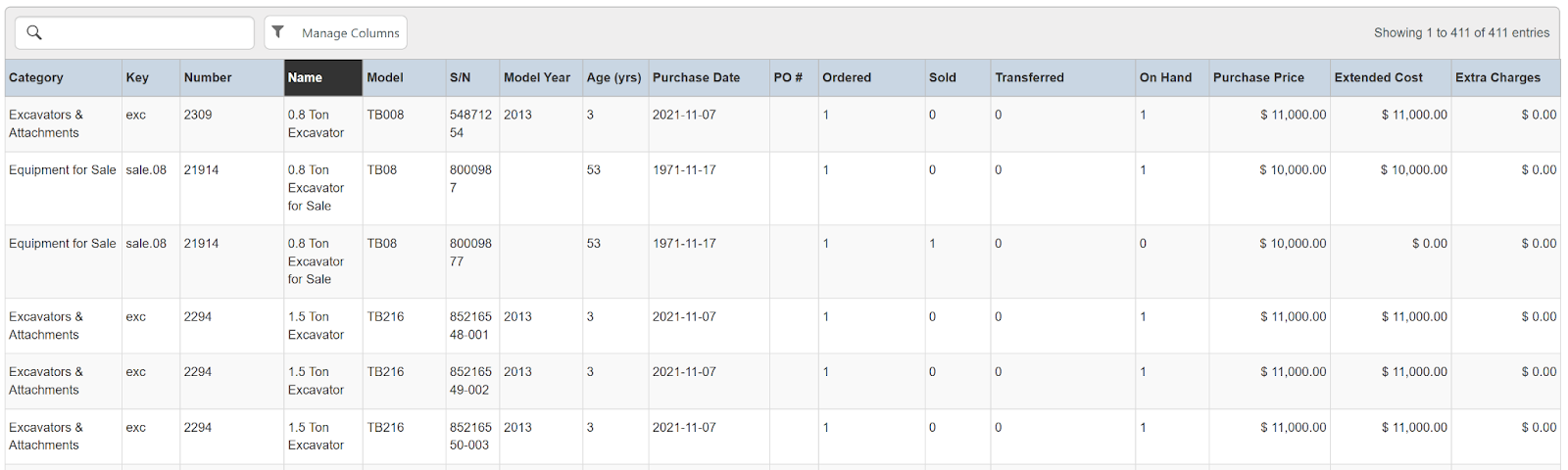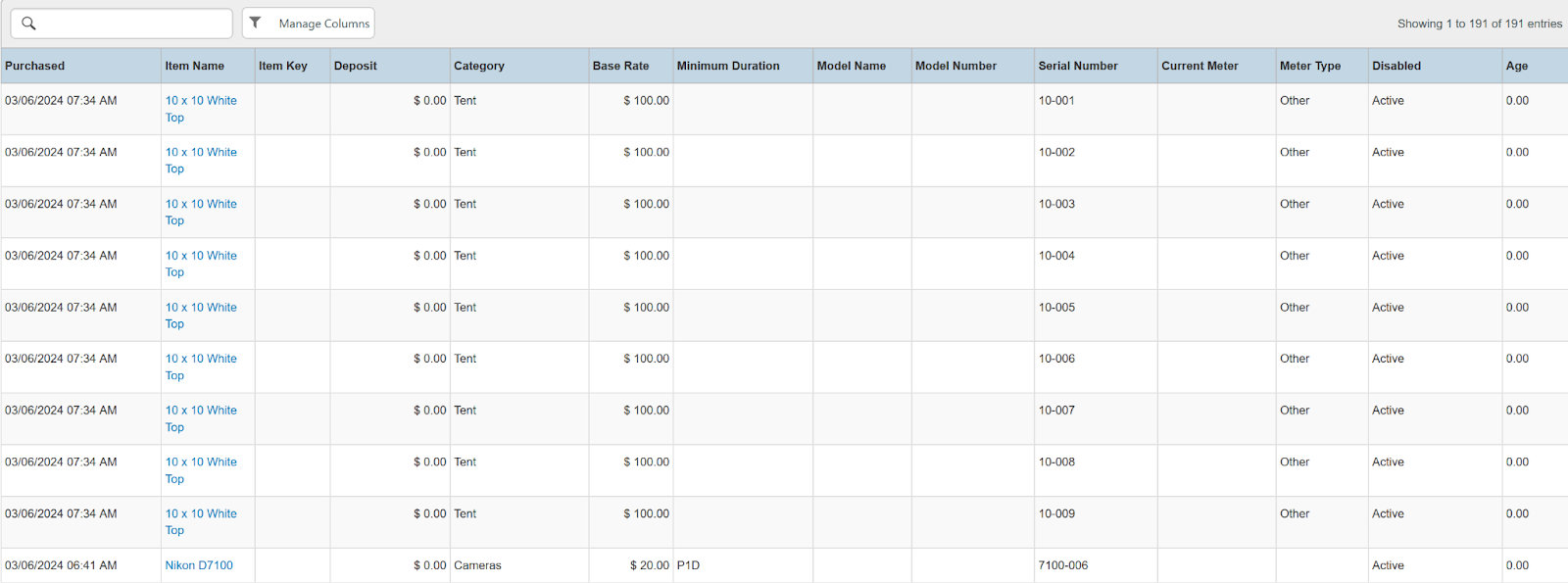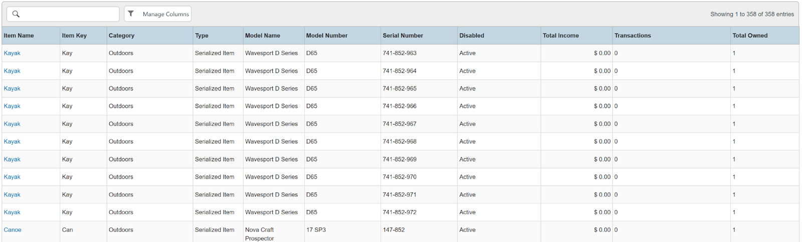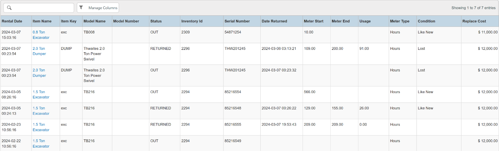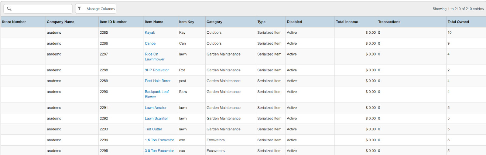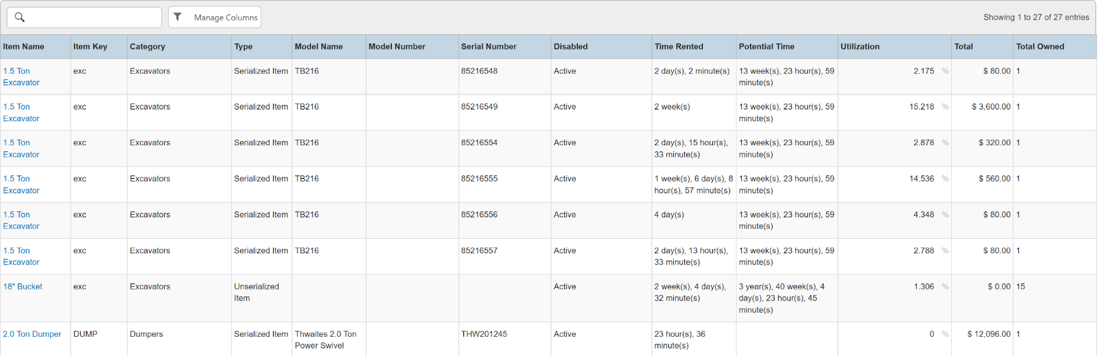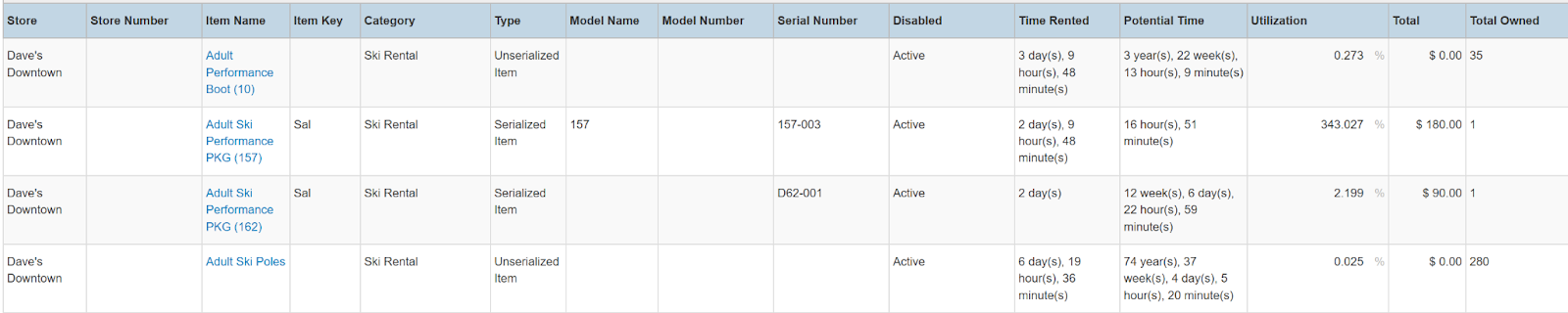 Columns: Store, Store Number, Item Name, Item Key, Category, Type, Model Name, Model Number, Serial Number, Disabled, Time Rented, Potential Time, Utilization, Total, Total Owned