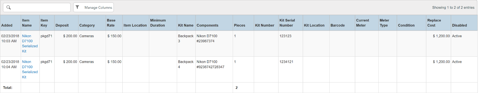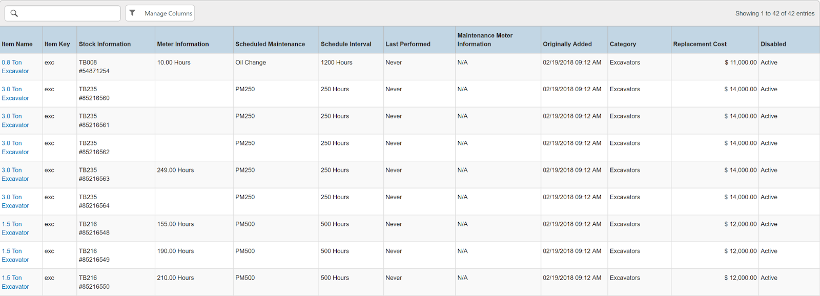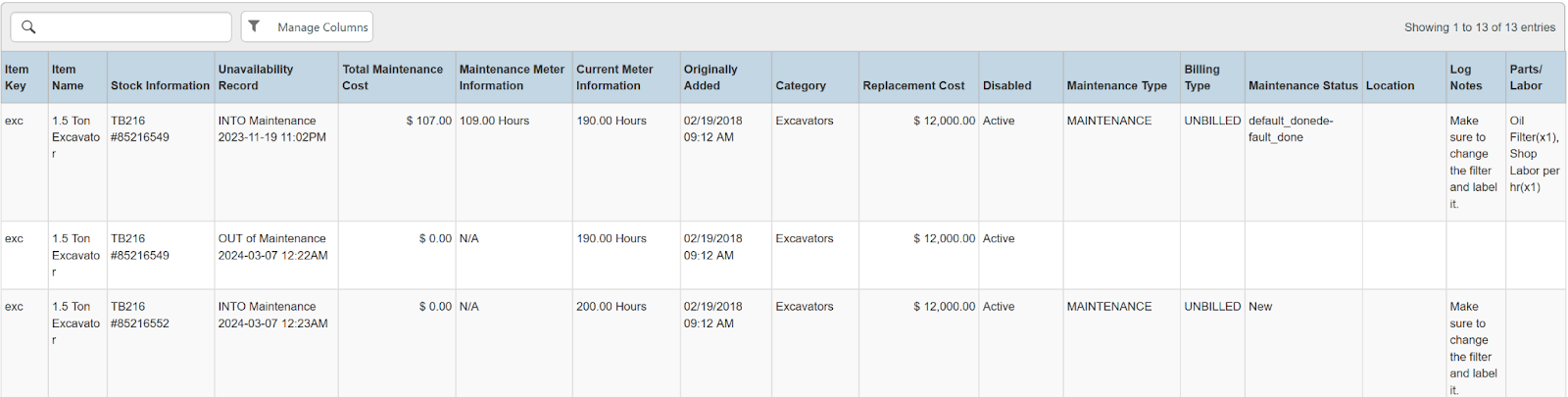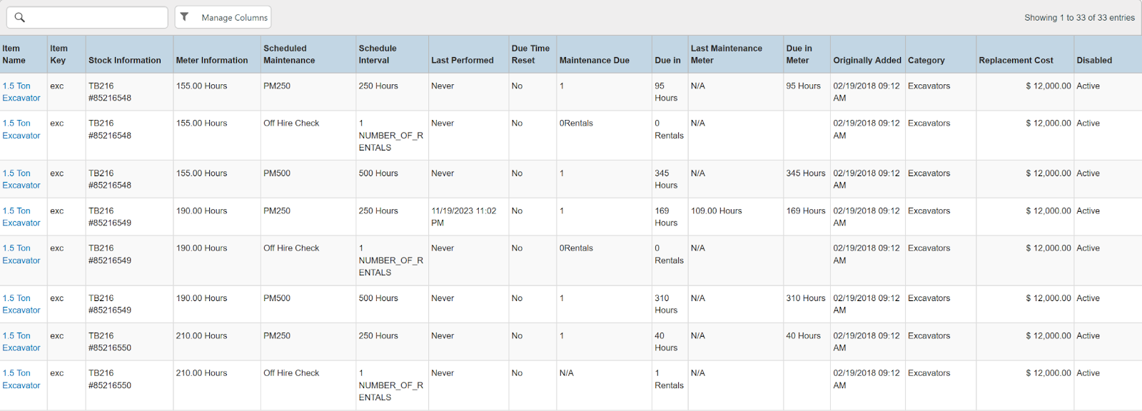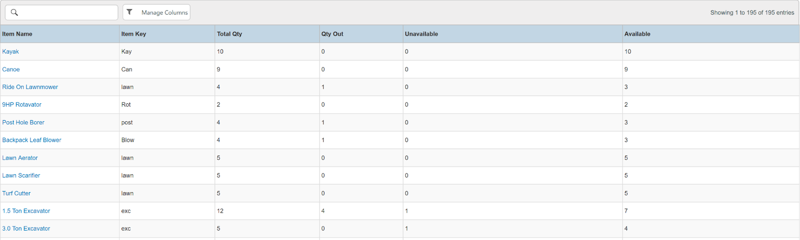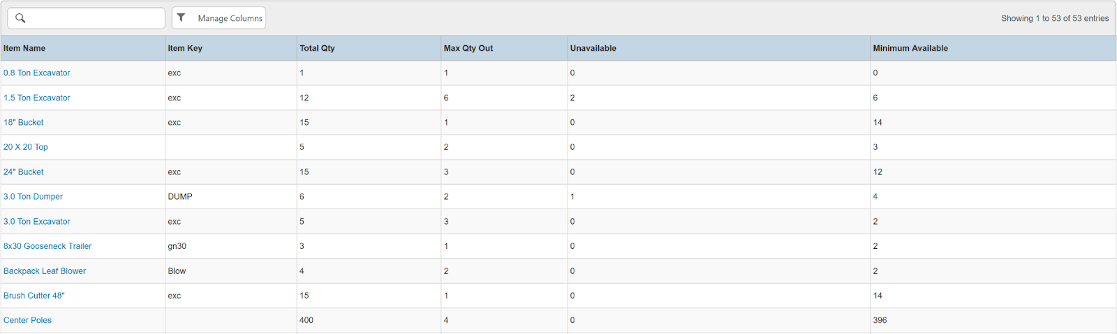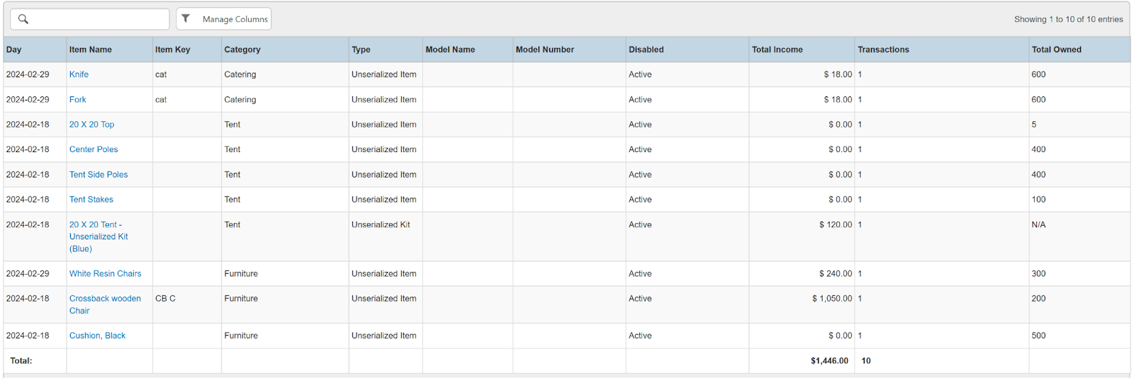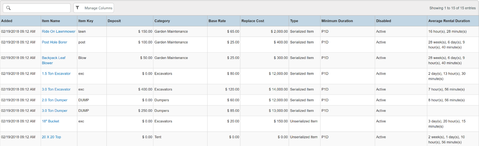 Columns: Store, Store Number, Item Name, Item Key, Category, Type, Model Name, Model Number, Serial Number, Disabled, Time Rented, Potential Time, Utilization, Total, Total Owned