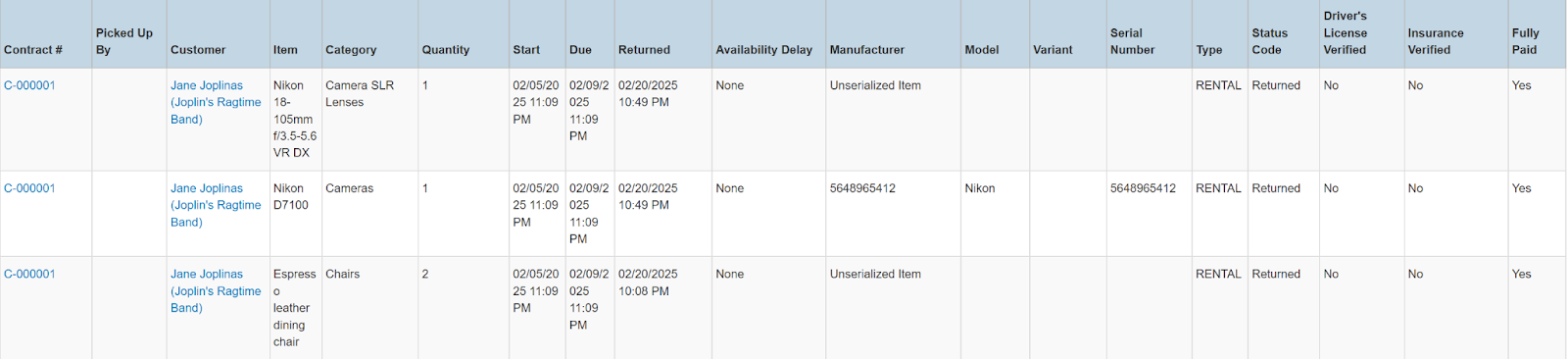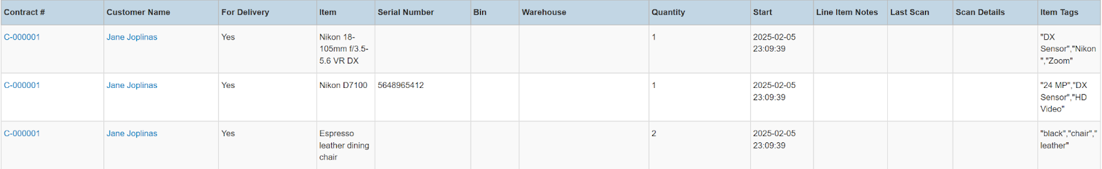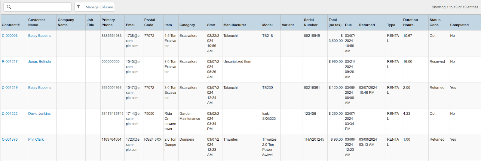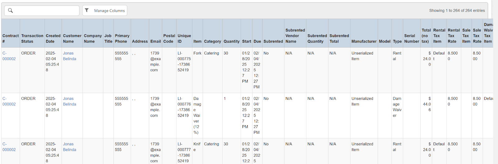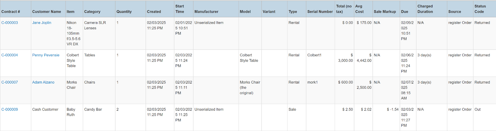 Columns: Store, Store Number, Contract #, Reservation Name, Picked Up By, Customer Name, National Id, Remote Id, Company Name, Job Title, Primary Phone, Address, Email, Postal Code, Item ID, Item, Category, Quantity, Start, Manufacturer, Model, Variant, Type, Serial Number, Total (no tax), Avg Cost, Sale Markup, Due, Charged Duration, Source, Status Code, Completed, Line Item, Removed, Item Deleted, Transaction Cancelled, Transaction Tags, Customer Tags