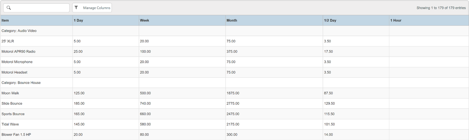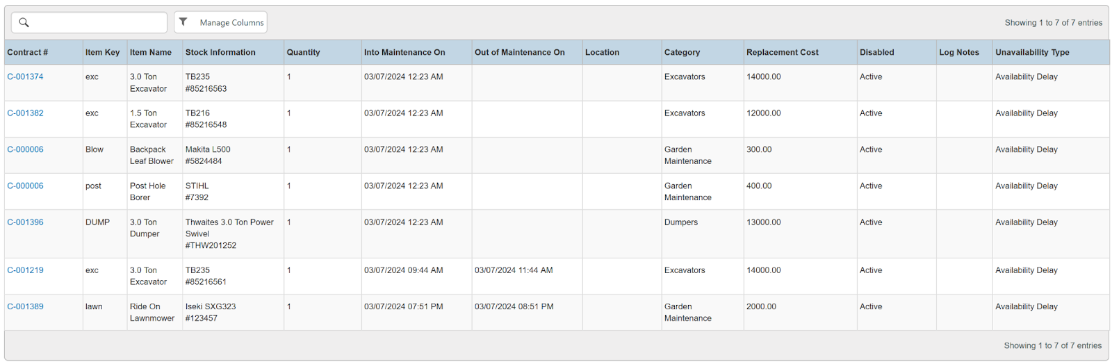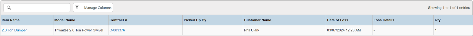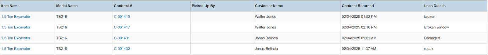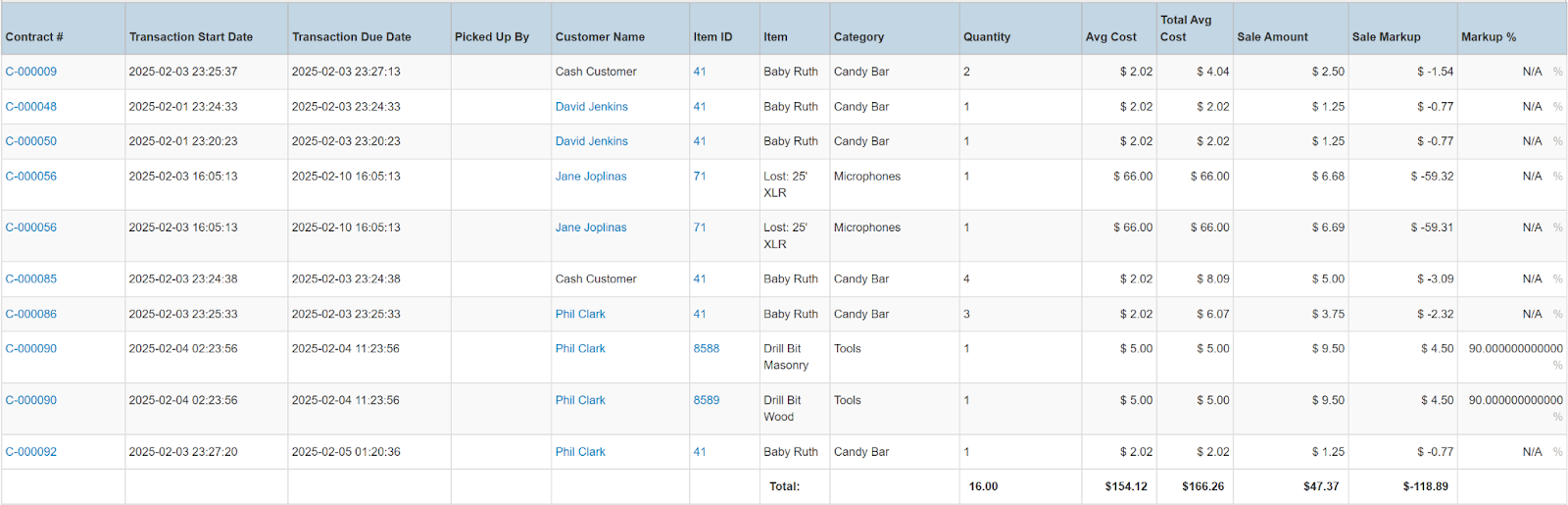 Columns: Store, Store Number, Contract #, Reservation Name, Picked Up By, Customer Name, National Id, Remote Id, Company Name, Job Title, Primary Phone, Address, Email, Postal Code, Item ID, Item, Category, Quantity, Start, Manufacturer, Model, Variant, Type, Serial Number, Total (no tax), Avg Cost, Sale Markup, Due, Charged Duration, Source, Status Code, Completed, Line Item, Removed, Item Deleted, Transaction Cancelled, Transaction Tags, Customer Tags