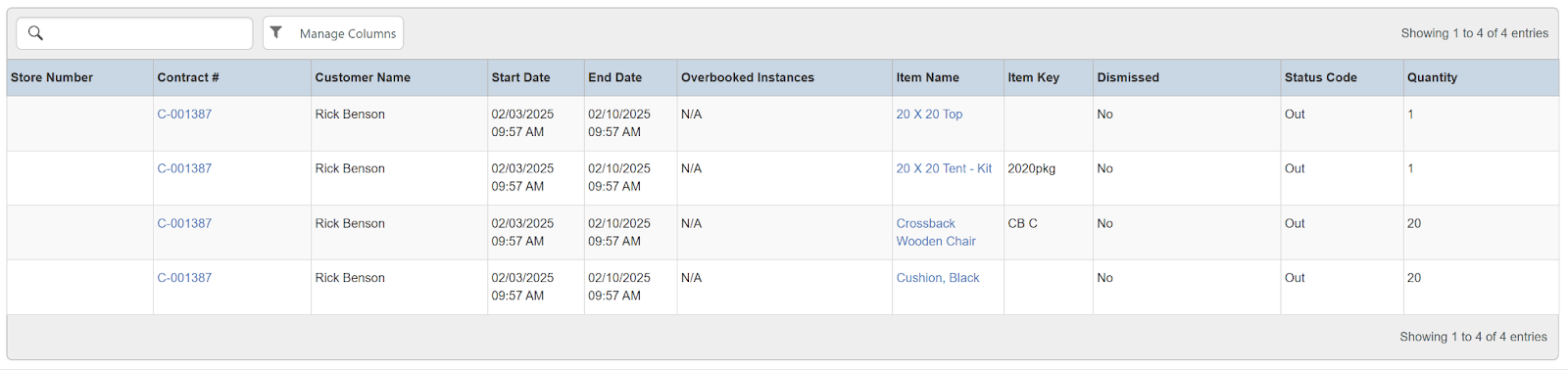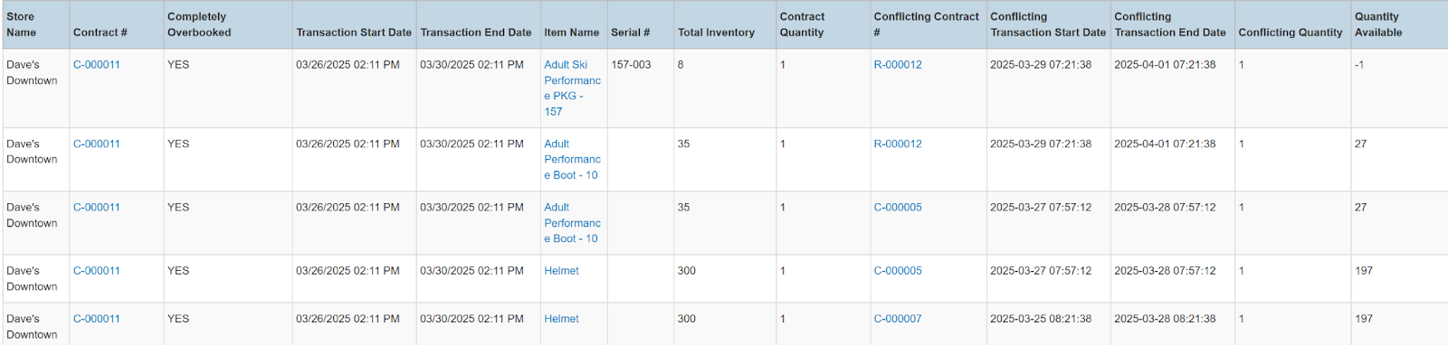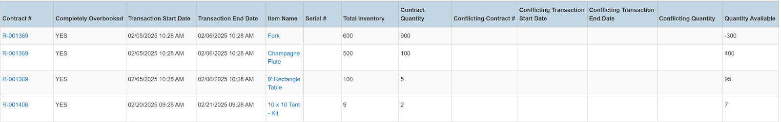 Columns: Store Name, Contract #, Completely Overbooked, Transaction Start Date, Transaction End Date, Item Name, Item Key, Category, Serial #, Total Inventory, Contract Quantity, Conflicting Contract #, Conflicting Transaction Start Date, Conflicting, Transaction End Date, Conflicting Quantity, Quantity Available