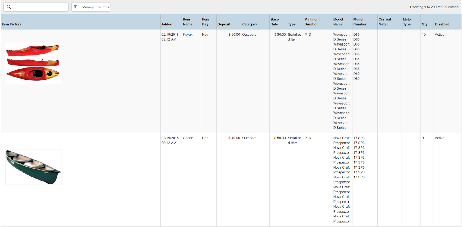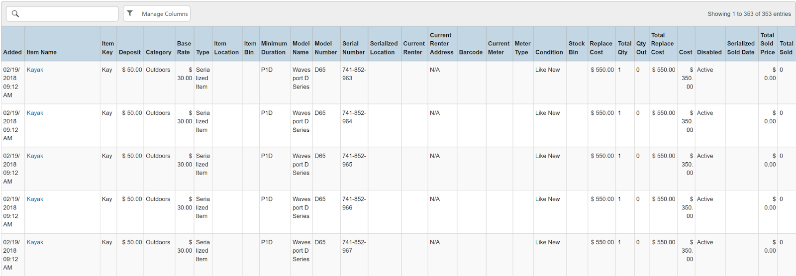 Columns: Store, Store Number, Item Name, Rental Code, Sale Barcode, Product Barcode, Product Description, Model Name, Model Number, Status, Serial Number, Condition, Contract, Purchase Order
