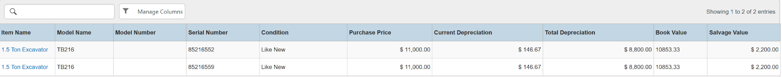 Gives a detailed list of current and/or past depreciation values for Items setup to be depreciated
