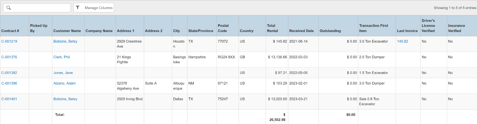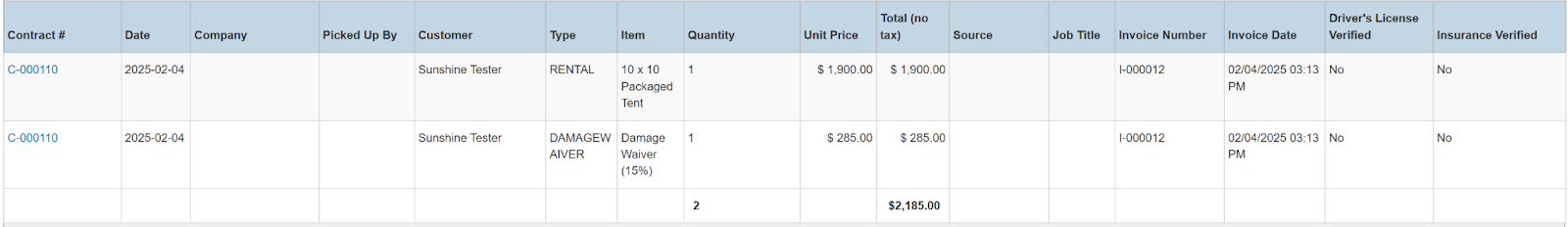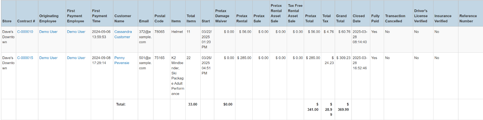 Columns: Store, Store Number, Contract #, Originating Employee, First Payment Employee, First Payment Time, Picked Up By, Customer Name, National Id, Remote Id, Company Name, Job Title, Primary Phone, Address, Email, Postal Code, Items, Item Barcode, Total Items, Start, Pretax Damage Waiver, Tax Free Damage Waiver, Pretax Rental, Tax Free Rental, Pretax Sale, Tax Free Sale, Pretax Rental Asset Sale, Tax Free Rental Asset Sale, Pretax Total, Total Tax, Grand Total, Pretax Breakout Category, Closed Date, Charged Duration, Source, Fully Paid, Transaction Cancelled, Driver's License Verified, Insurance Verified, Reference Number