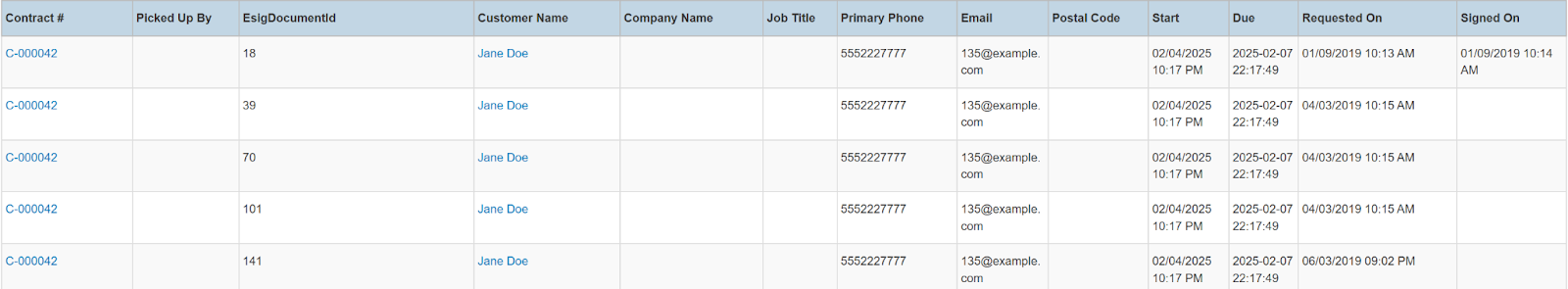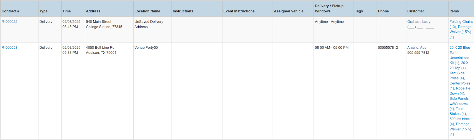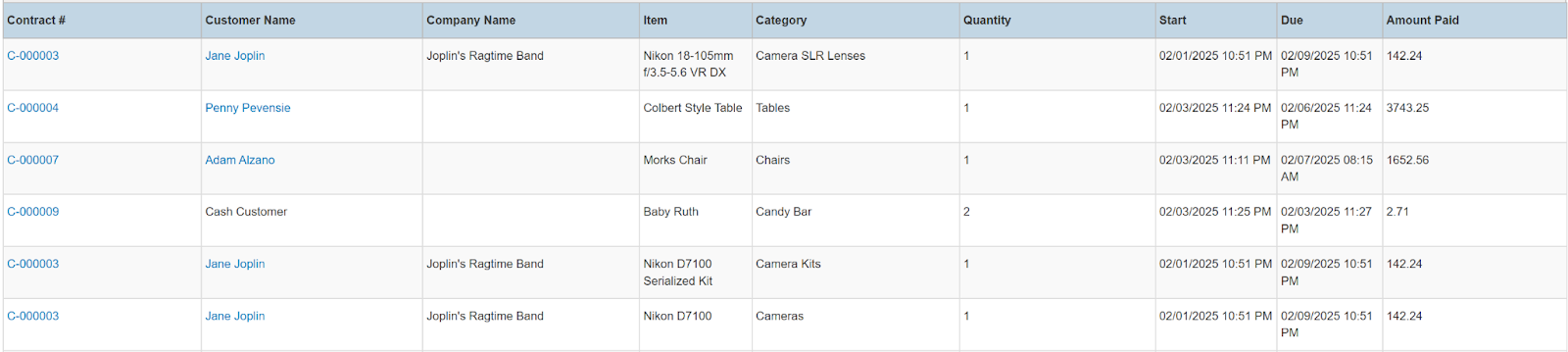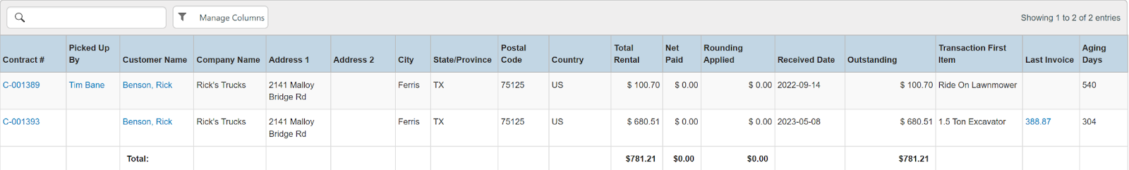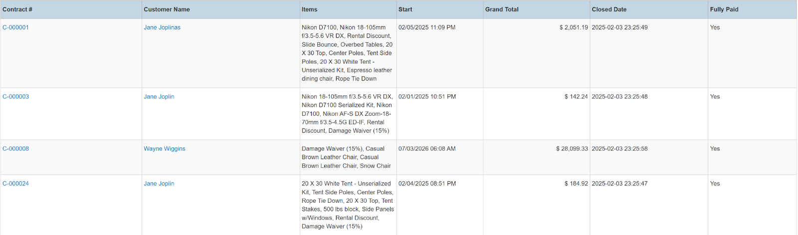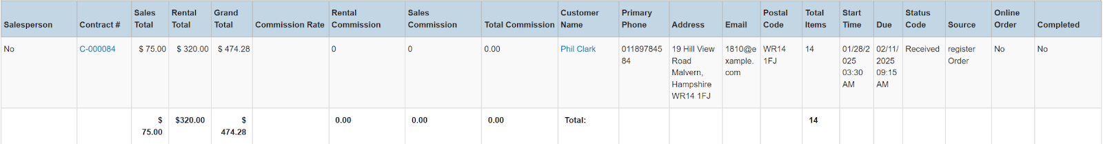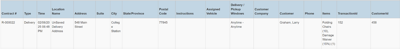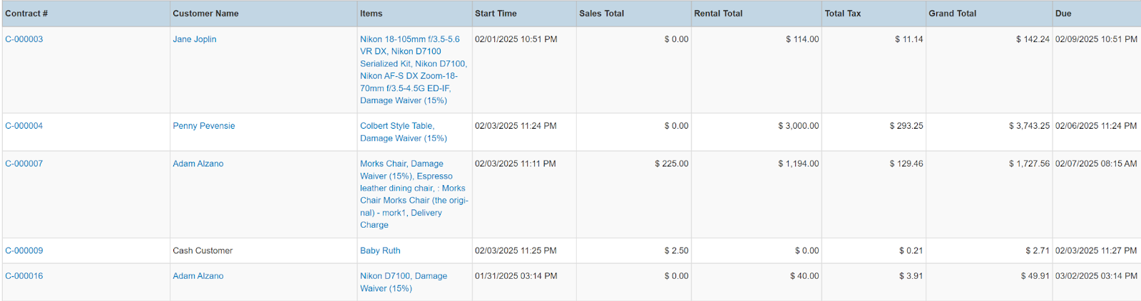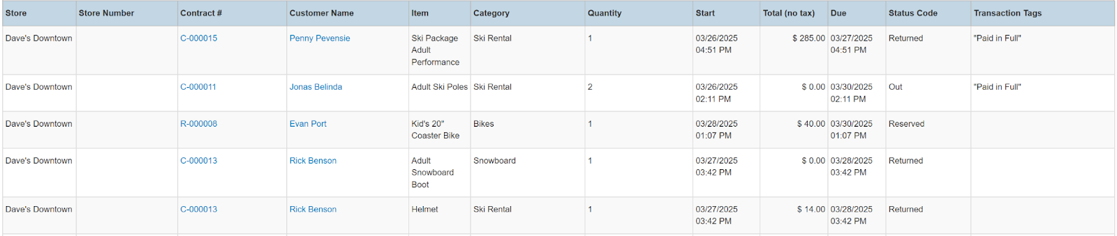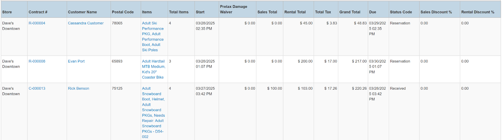 Columns: Store, Store Number, Contract #, Employees, Picked Up By, Customer Name, National Id, Remote Id, Company Name, Job Title, Primary Phone, Address, Email, Postal Code, Items, Total Items, Start, Pretax Damage Waiver, Tax Free Damage Waiver, Pretax Total, Sales Total, Rental Total, Total Tax, Grand Total, Due, Charged Duration, Source, Status Code, Online Order, Completed, Transaction Cancelled, Sales Discount %, Rental Discount %, Sale Discount Name, Sales Discount, Rental Discount Name, Rental Discount, Transaction Tags, Customer Tags