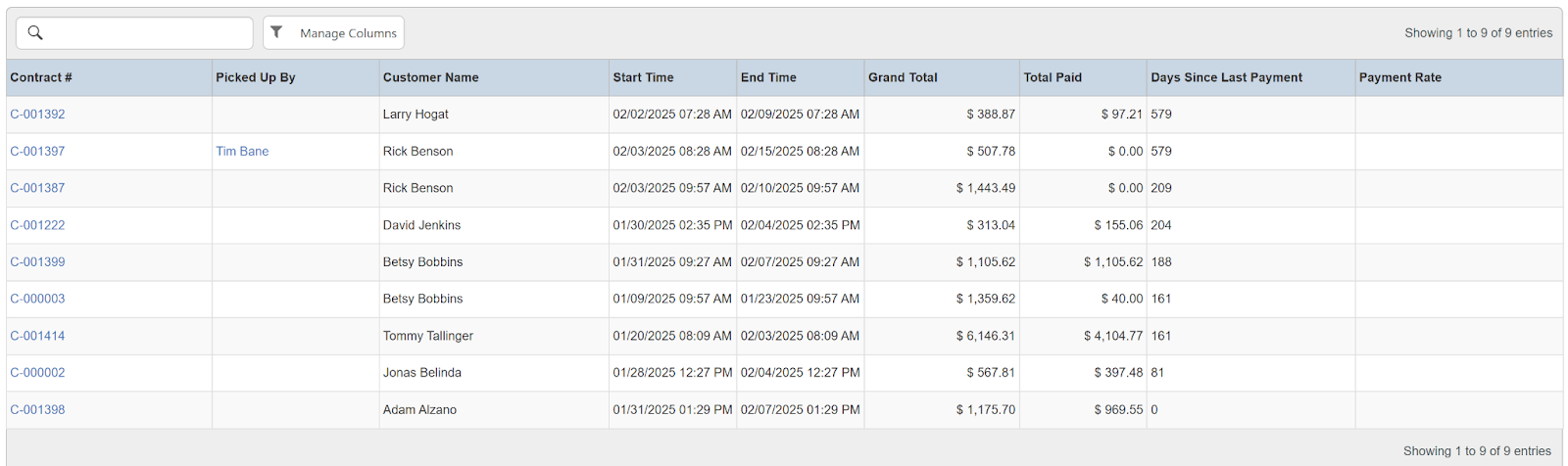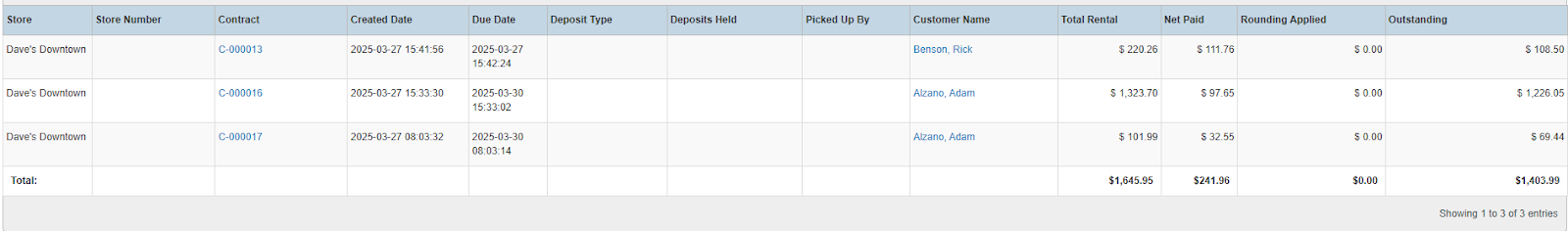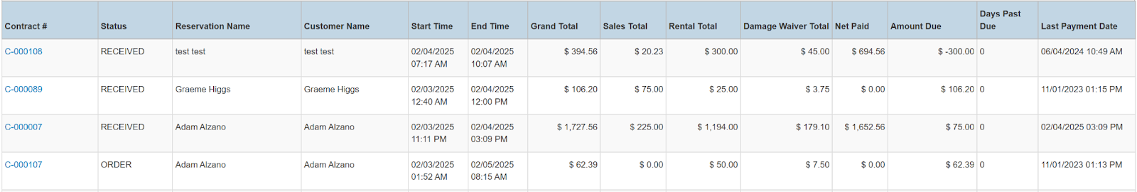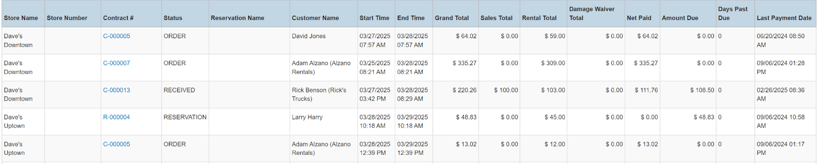 Columns: Store Name, Store Number, Contract #, Purchase Order #, Status, Reservation Name, Customer Name, National Id, Remote Id, Start Time, End Time, Grand Total, Sales Total, Rental Total, Damage Waiver Total, Net Paid, Amount Due, Days Past Due, Last Payment Date