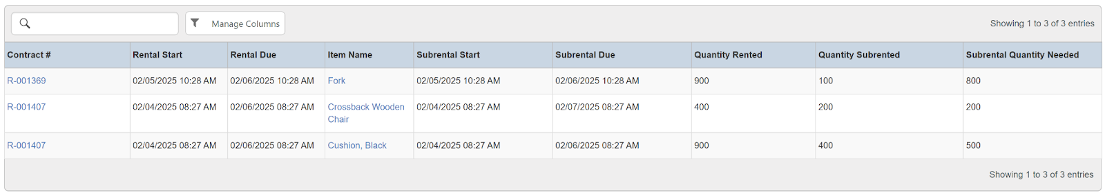 Filters: Company, Optional suggested items prevent rental, Display Overage items