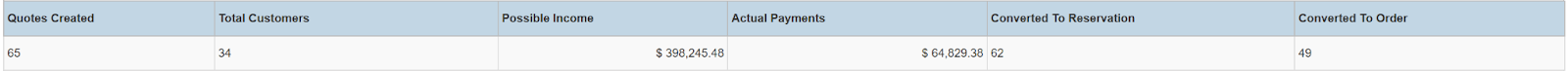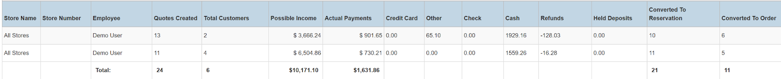 Columns: Store Name, Store Number, Employee, Quotes Created, Total Customers, Possible Income, Actual Payments, Credit Card, Other, Check, Cash, Refunds, Held Deposits, Converted To Reservation, Converted To Order