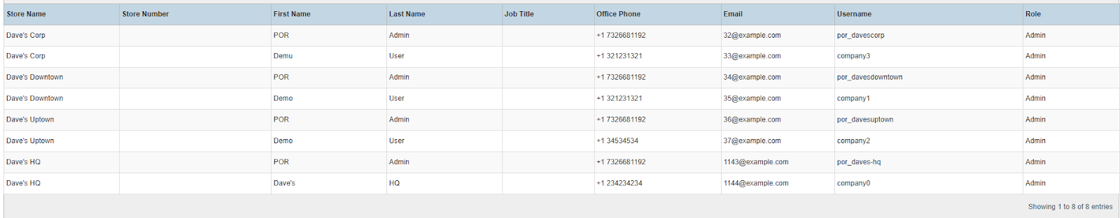 Columns: Store Name, Store Number, First Name, Last Name, Job Title, Office Phone, Email, Username, Role