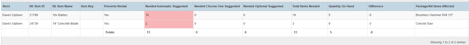 Columns: Store, RE Item ID, RE Item Name, Item Key, Prevents Rental, Needed Automatic Suggested, Needed Choose One, Suggested, Needed Optional Suggested, Total Items Needed, Quantity On Hand, Difference, Package/Kit Items Affected