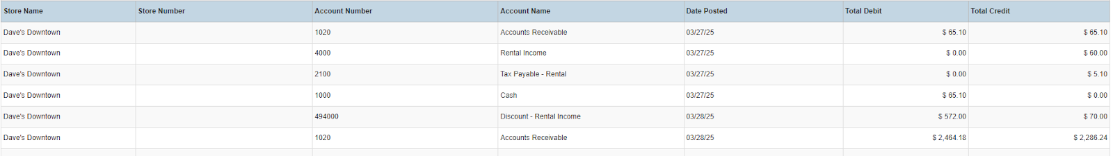 Columns: Store Name, Store Number, Account Number, Account Name, Date Posted, Total Debit, Total Credit