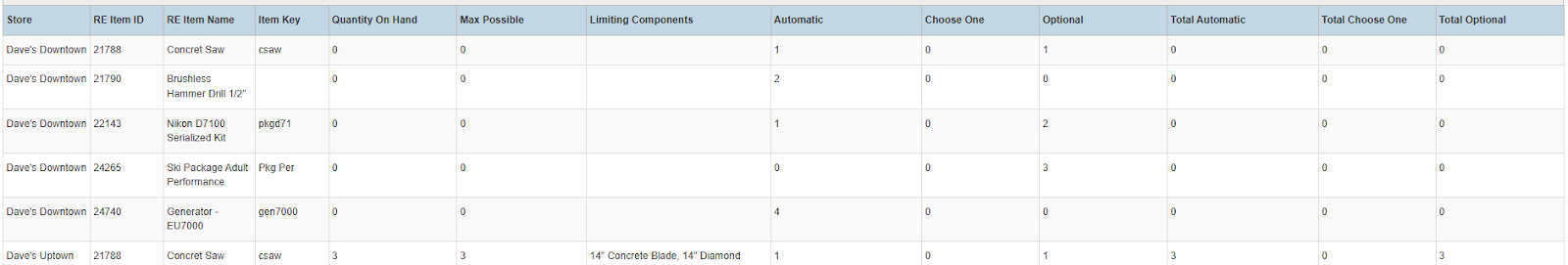 Columns: Store, RE Item ID, RE Item Name, Item Key, Quantity On Hand, Max Possible, Limiting Components, Automatic, Choose One, Optional, Total Automatic, Total Choose One, Total Optional