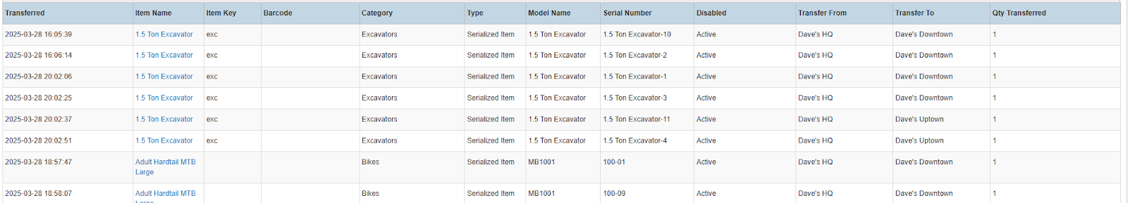 Columns: Transferred, Item Name, Item Key, Barcode, Category, Type, Model Name, Serial Number, Disabled, Transfer From, Transfer To, Qty Transferred