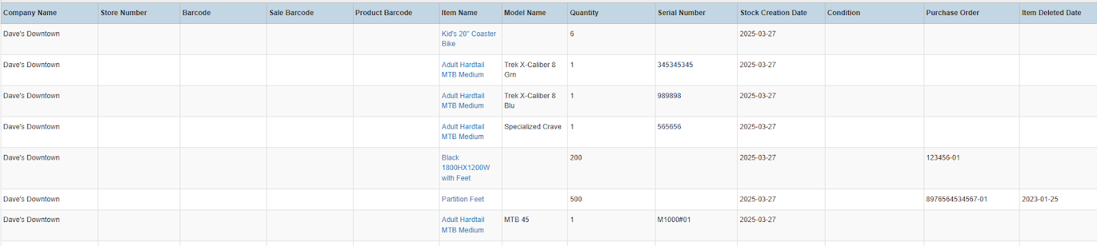Columns: Company Name, Store Number, Barcode, Sale Barcode, Product Barcode, Item Name, Model Name, Quantity, Serial Number, Stock Creation Date, Condition, Purchase Order, Item Deleted Date
