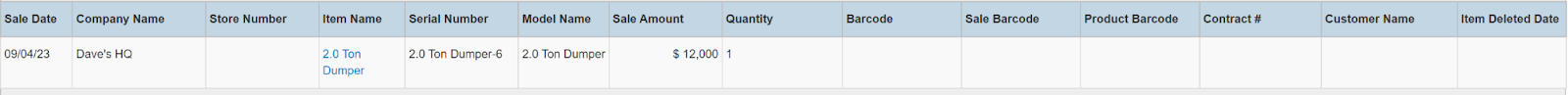 Columns: Sale Date, Company Name, Store Number, Item Name, Serial Number, Model Name, Sale Amount, Quantity, Barcode, Sale Barcode, Product Barcode, Contract #, Customer Name, National Id, Remote Id, Item Deleted Date