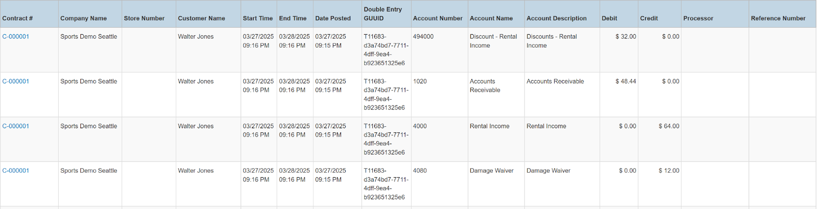 Columns: Contract #, Company Name, Store Number, Customer Name, National Id, Remote Id, Start Time, End Time, Date Posted, Double Entry GUUID, Account Number, Account Name, Account Description, Debit, Credit, Processor, Reference Number