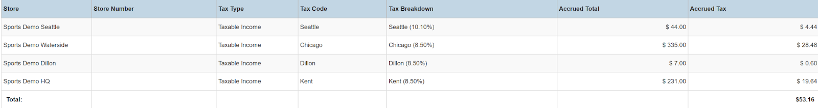 Columns: Store, Store Number, Tax Type, Tax Code, Tax Breakdown, Accrued Total, Accrued Tax