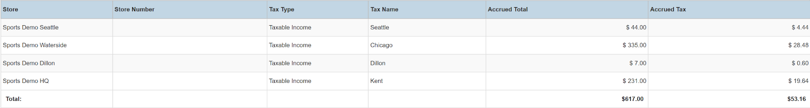 Columns: Store, Store Number, Tax Type, Tax Name, Accrued Total, Accrued Tax, Region ID, Region Store