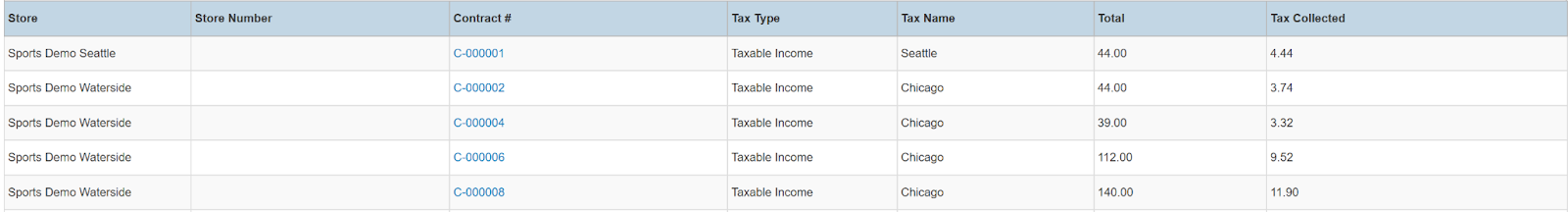 Columns: Store, Store Number, Contract #, Tax Type, Tax Name, Total, Tax Collected