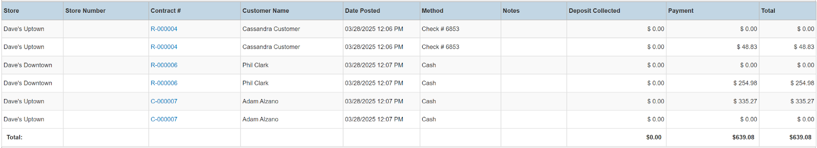 Columns: Store, Store Number, Contract #, Customer Name, National Id, Remote Id, Date Posted, Method, Notes, Deposit Collected, Payment, Total