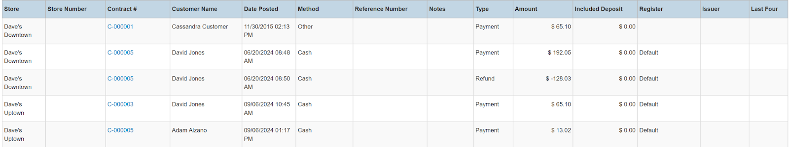 Columns: Store, Store Number, Contract #, Purchase Order #, Customer Name, National Id, Remote Id, Date Posted, Method, Reference Number, Notes, Type, Amount, Included Deposit, Register, Issuer, Last Four