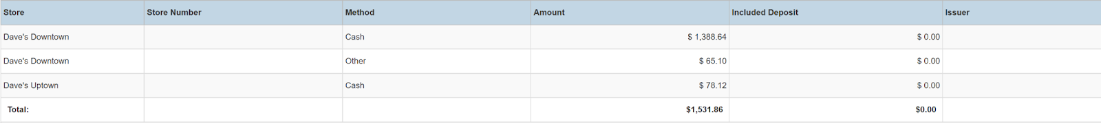 Columns: Store, Store Number, Method, Amount, Included Deposit, Issuer