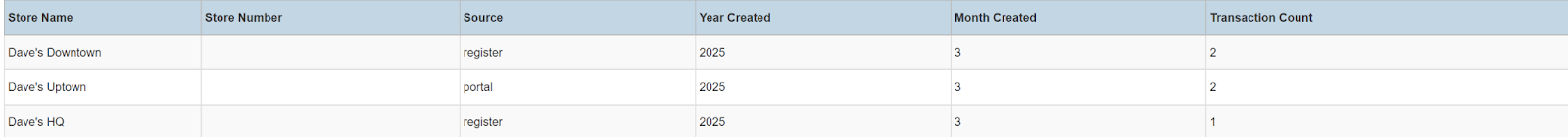 Columns: Store Name, Store Number, Source, Year Created, Month Created, Transaction Count