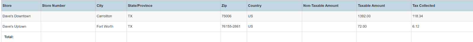 Columns: Store, Store Number, City, State/Province, Zip, Country, Non-Taxable Amount, Taxable Amount, Tax Collected