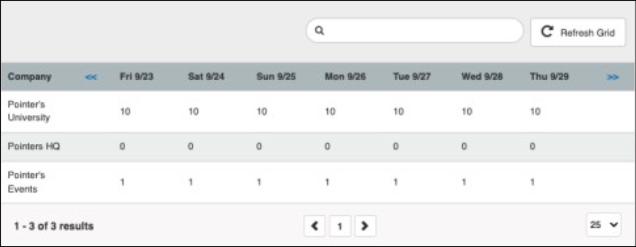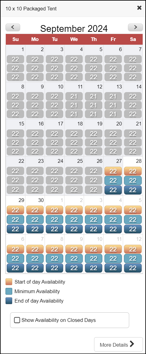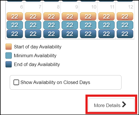 In the calendar, each day has a set of three numbers that indicate the availability of an item throughout the day. The color code indicates the time of day and minimum availability.