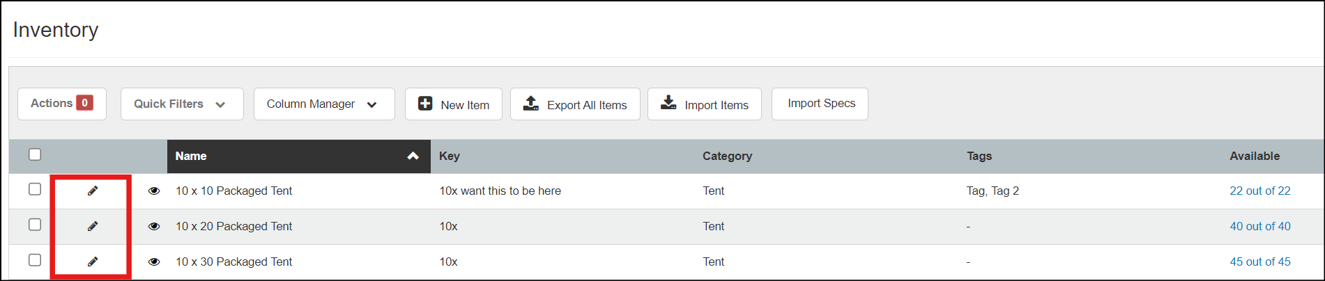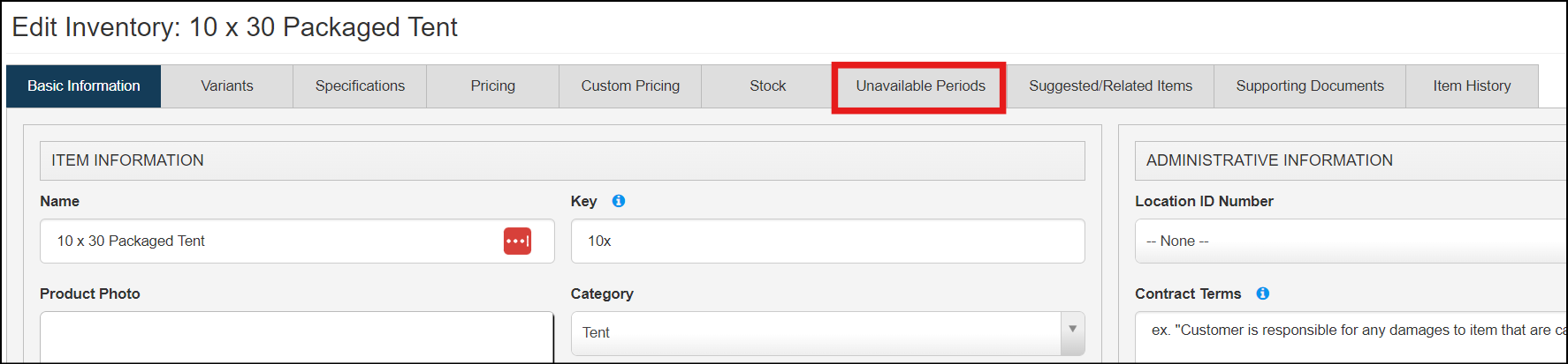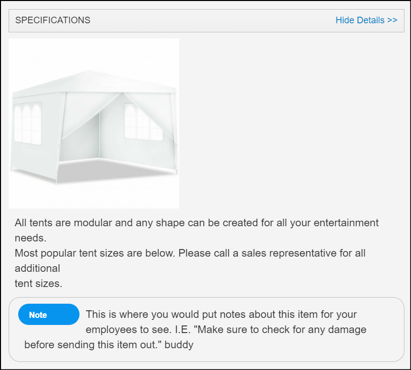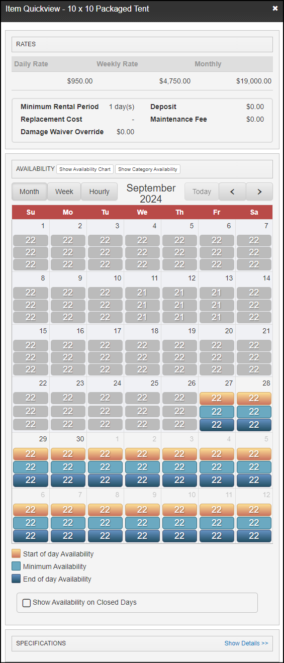 This menu contains more details like the item's Rate, category availability, availability broken down by Month, Week, or Hourly, and item specifications.