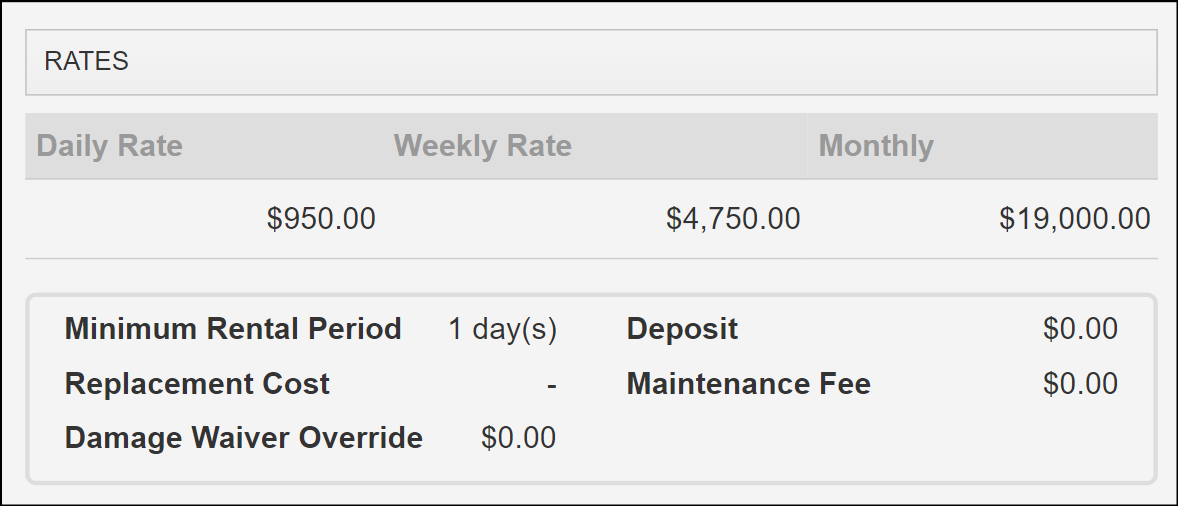 This section displays the item's pricing rates and other pricing information, including the Minimum Rental Period, Prepayment, Replacement Cost, Maintenance Fee, and Damage Protection Override. Note: Damage Waiver Override will not populate any information if a default percentage is set in Configuration > Company Configuration.
